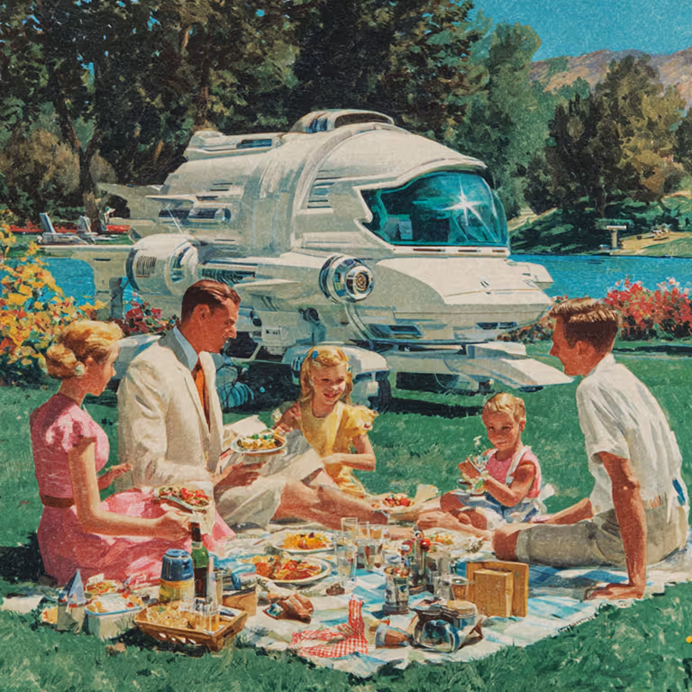 Prompt: Family enjoying retro picnic with futuristic twist.